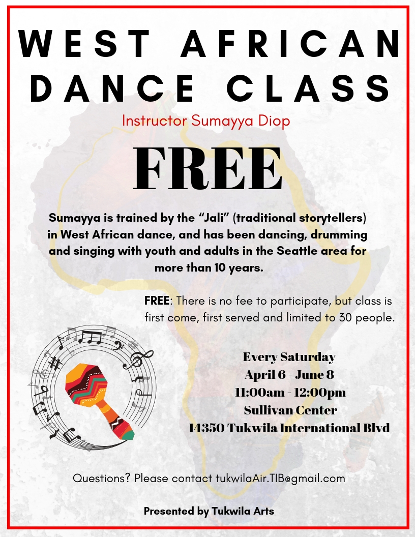 Tukwila Arts is collaborating with instructor Sumayya Diop to offer free West African Dance Classes at the Sullivan Center.