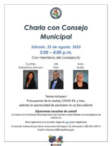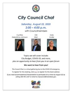 Councilmembers Delostrinos-Johnson, Idan, and Kruller are hosting a virtual Council Chat on Saturday, August 22, 2020 at 3:00 p.m. Join the Councilmembers in a discussion of Budget, COVID-19, and more, as well as an open forum opportunity to share what’s on your mind. To participate, sign up for the Zoom webinar here: https://us02web.zoom.us/webinar/register/WN_jYZasqvIRqyFVcZI-njqqw