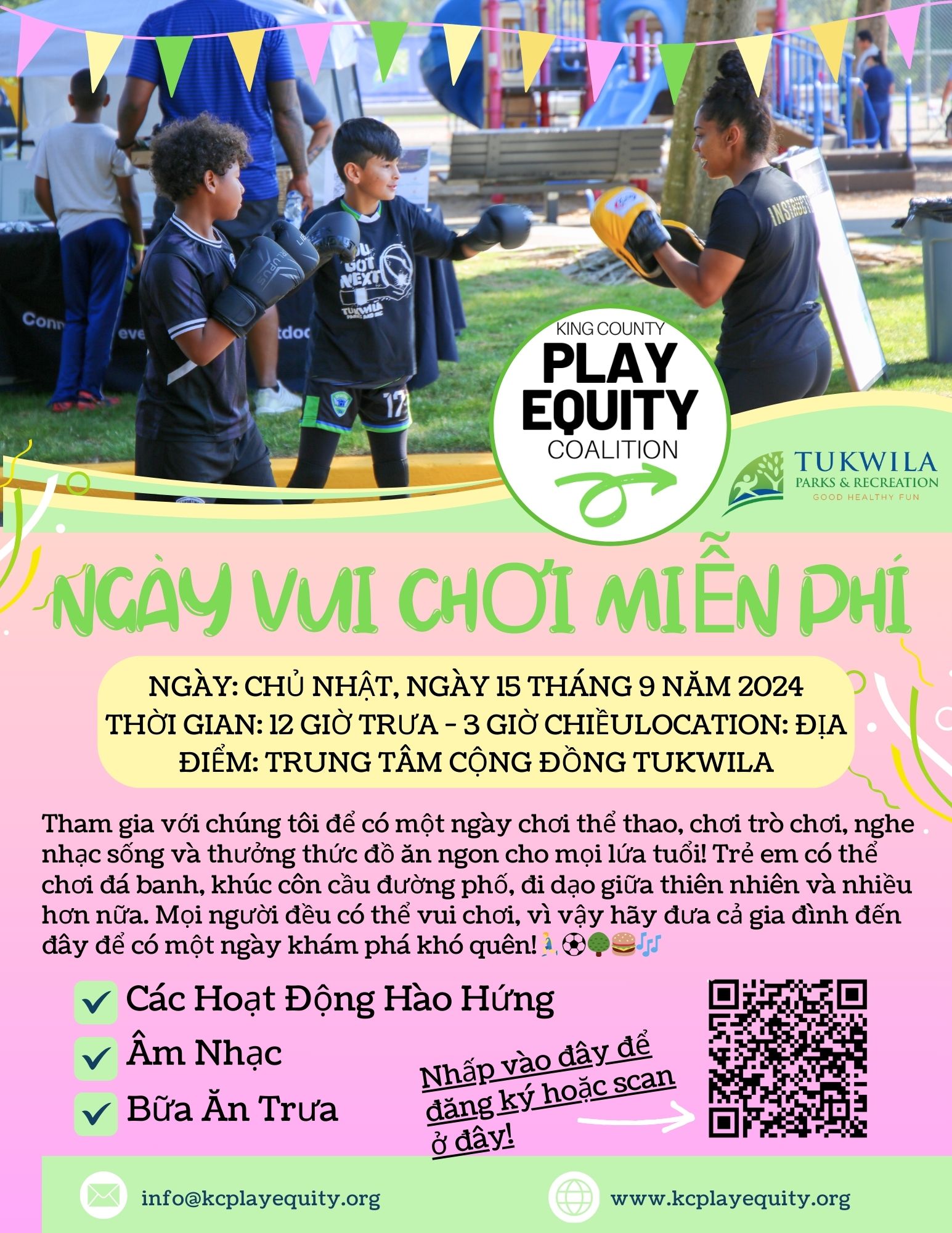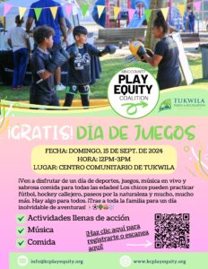 Let’s come together as a community and enjoy a day of play and laughter. Don’t miss out on this exciting event – mark your calendars now! This Event is brought to you by the King County Play Equity Coalition and Tukwila Parks and Recreation.
