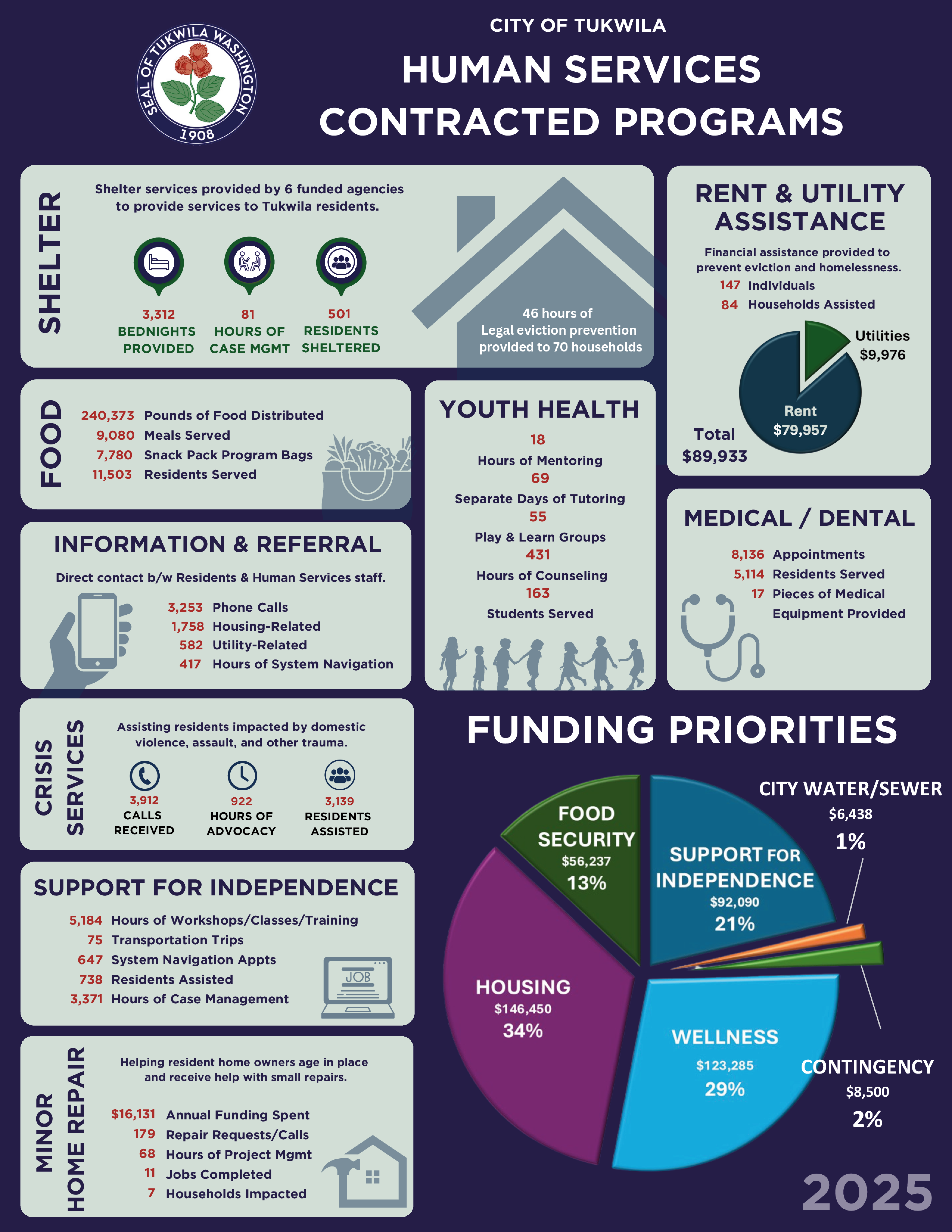The City of Tukwila has been providing funding for human services since 1992. In this work, Human Services staff have three primary functions: