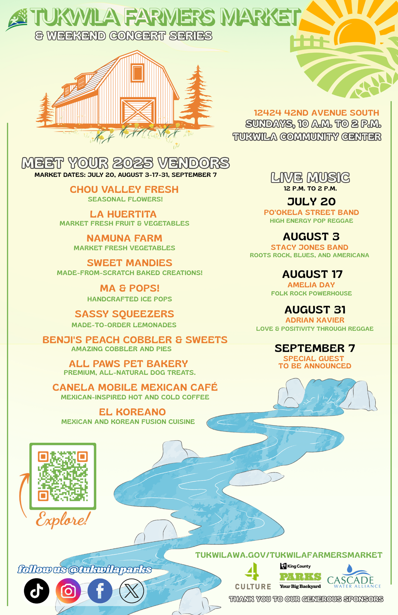 Enjoy a lazy Sunday at the Tukwila Farmers Market! Take in one – or all – of our summer weekend concerts!