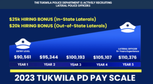 ENTRY LEVEL – $94,632 starting salary. Applicants interested in testing for open Entry-Level Police Officer positions must begin the process by testing with Public Safety Testing. Public Safety Testing will conduct the written and physical agility tests and then send passing scores to the Tukwila Civil Service Examiner. As staffing needs arise, the department will invite those whose scores have been received by the Tukwila Civil Service Examiner to begin the rest of the testing process. The process includes an oral board, chief’s interview, background investigation, polygraph examination, written and oral psychological exams and a medical exam. The entire process can take 2-6 months.