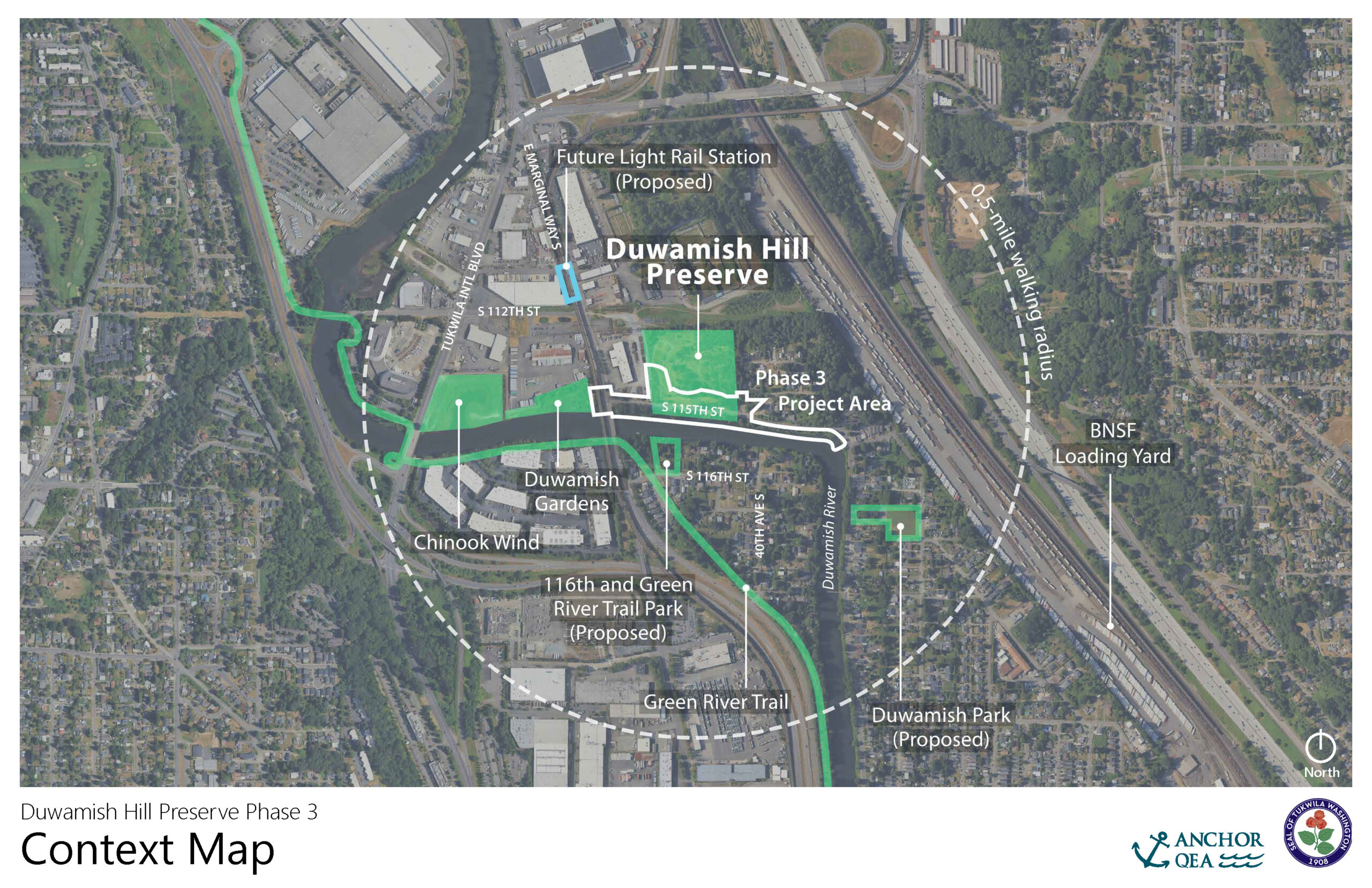 The purpose of this project is to improve shoreline conditions along approximately 700 lineal feet of Duwamish River right bank shoreline.  Duwamish Hill Preserve is a roughly 10-acre city park and nature preserve.  The park has been owned and managed by the city for approximately 25 years, following initial land acquisition led by Forterra.  At that time, the city commissioned a park master plan, and has since worked to build out trails, gathering places and planting as identified in the plan.  The remaining piece of the masterplan is the shoreline setback component of the project, Phase 3.  The City and Forterra recently acquired two small parcels of land along S 115th St, expanding the park footprint per the master plan.