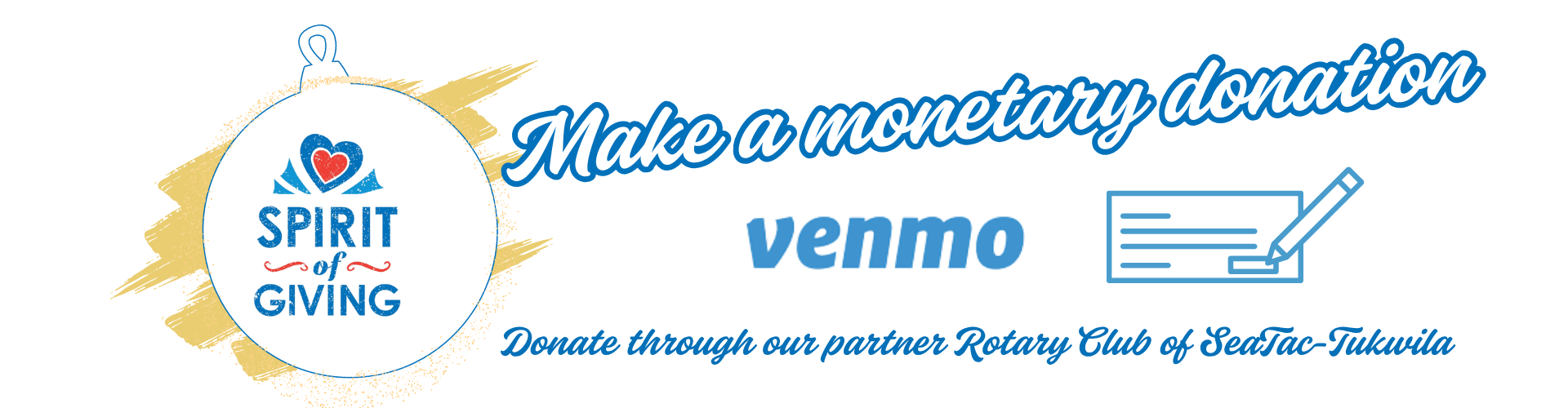 • Use your existing Venmo account or create one to make a payment to @SeaTacTukwilaRotaryFoundationNote “Spirit of Giving” in the “What’s this for?” field when making your donation.