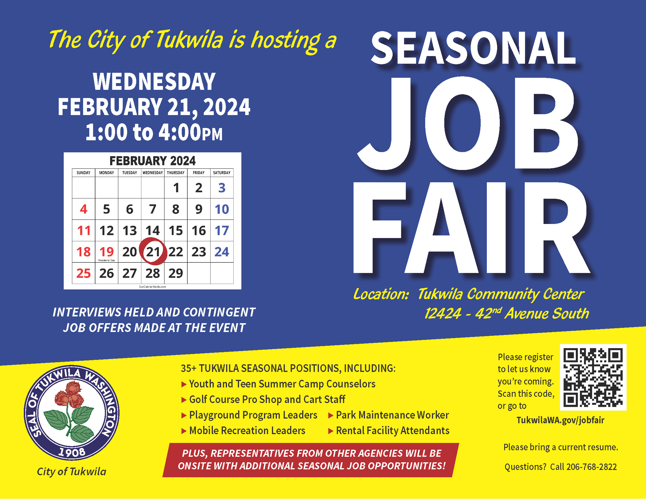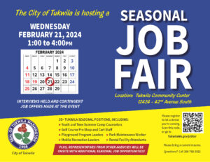We are excited to host a job fair at the Tukwila Community Center on February 21 from 1:00 pm – 4:00 pm.