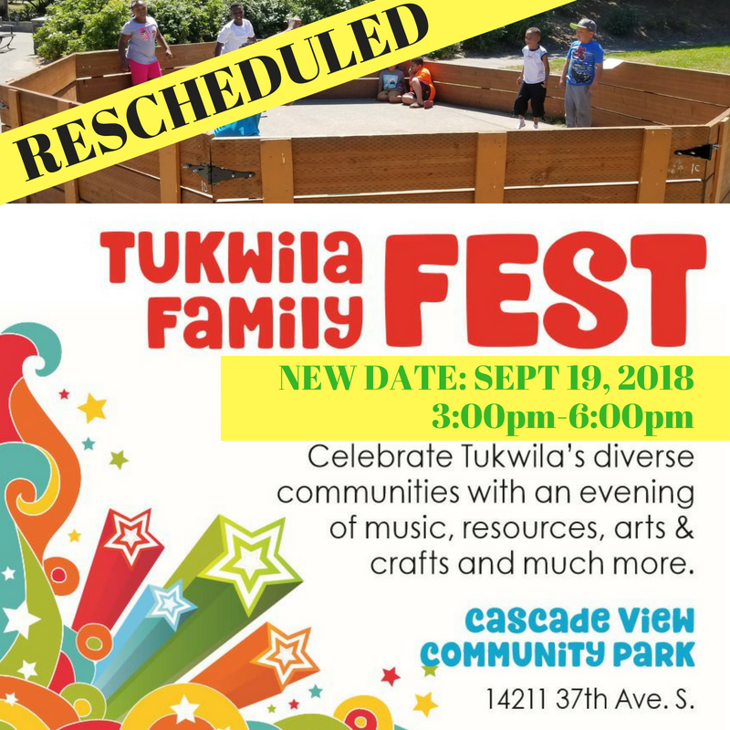 Due to extremely poor air quality, Family Fest is rescheduled for September 19th, 3:00pm-6.00pm. The health and safety of the community is always the first priority for Tukwila Parks and Recreation. For updated information on the air quality and safety visit Puget Sound Clean Air at www.pscleanair.org. Looking forward to seeing everyone September 19, 3:00-6:00pm for Family Fest.