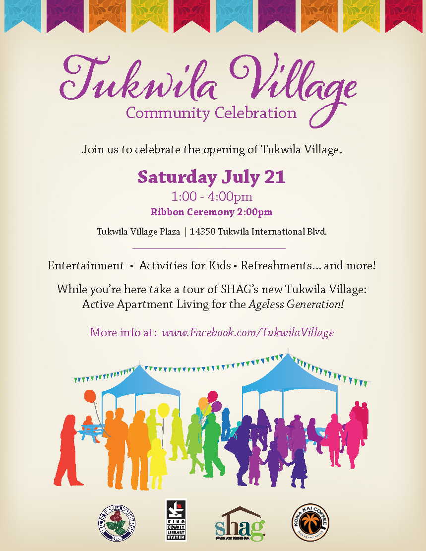 You’re invited to the Tukwila Village Community Celebration! The festivities will be held on the Tukwila Village plaza on Saturday, July 21, 2018 from 1:00 to 4:00 PM. The program starts at 2:00 PM. Enjoy performances, games for kids, and tours of the SHAG apartments before and after the program.